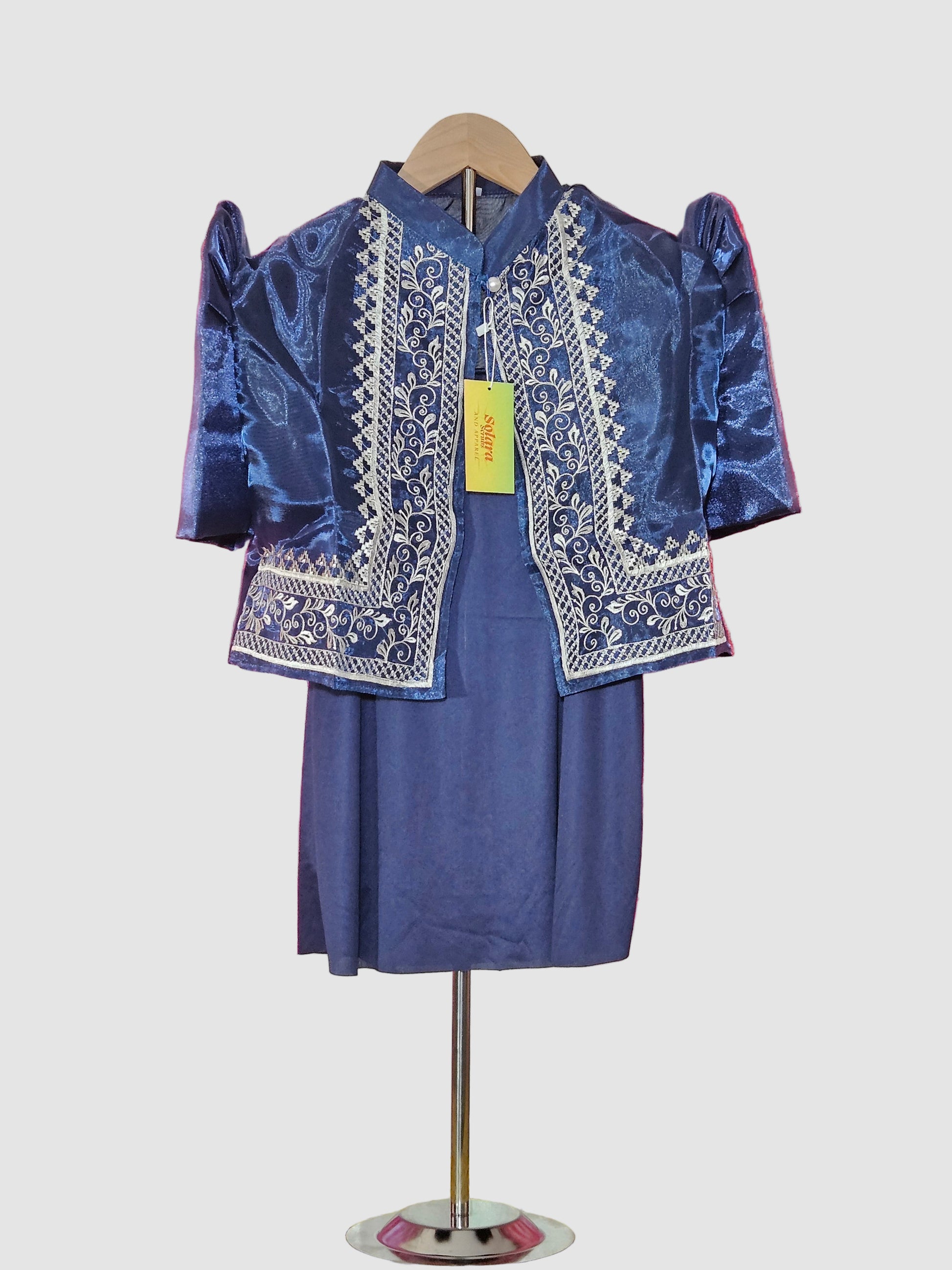 This navy blue bolero features elegant gold embroidery with an intricate pattern, adding a refined touch to any outfit. Its tailored fit offers comfort and style, making it perfect for both formal and casual occasions.