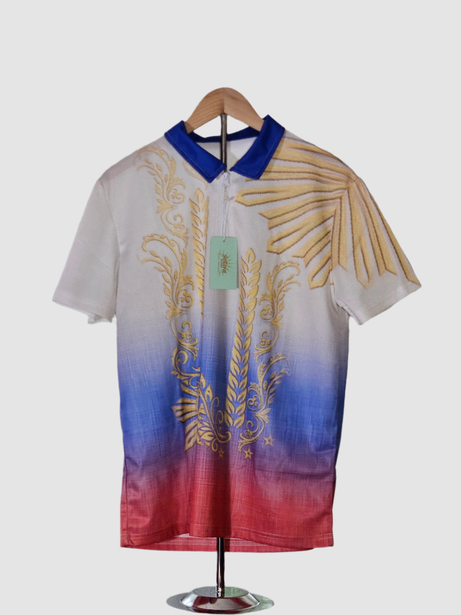 - This short-sleeved Barong Tagalog features a design inspired by the Philippine flag, combining traditional elegance with patriotic symbolism. Crafted for comfort and style, it is ideal for formal occasions that celebrate Filipino heritage.