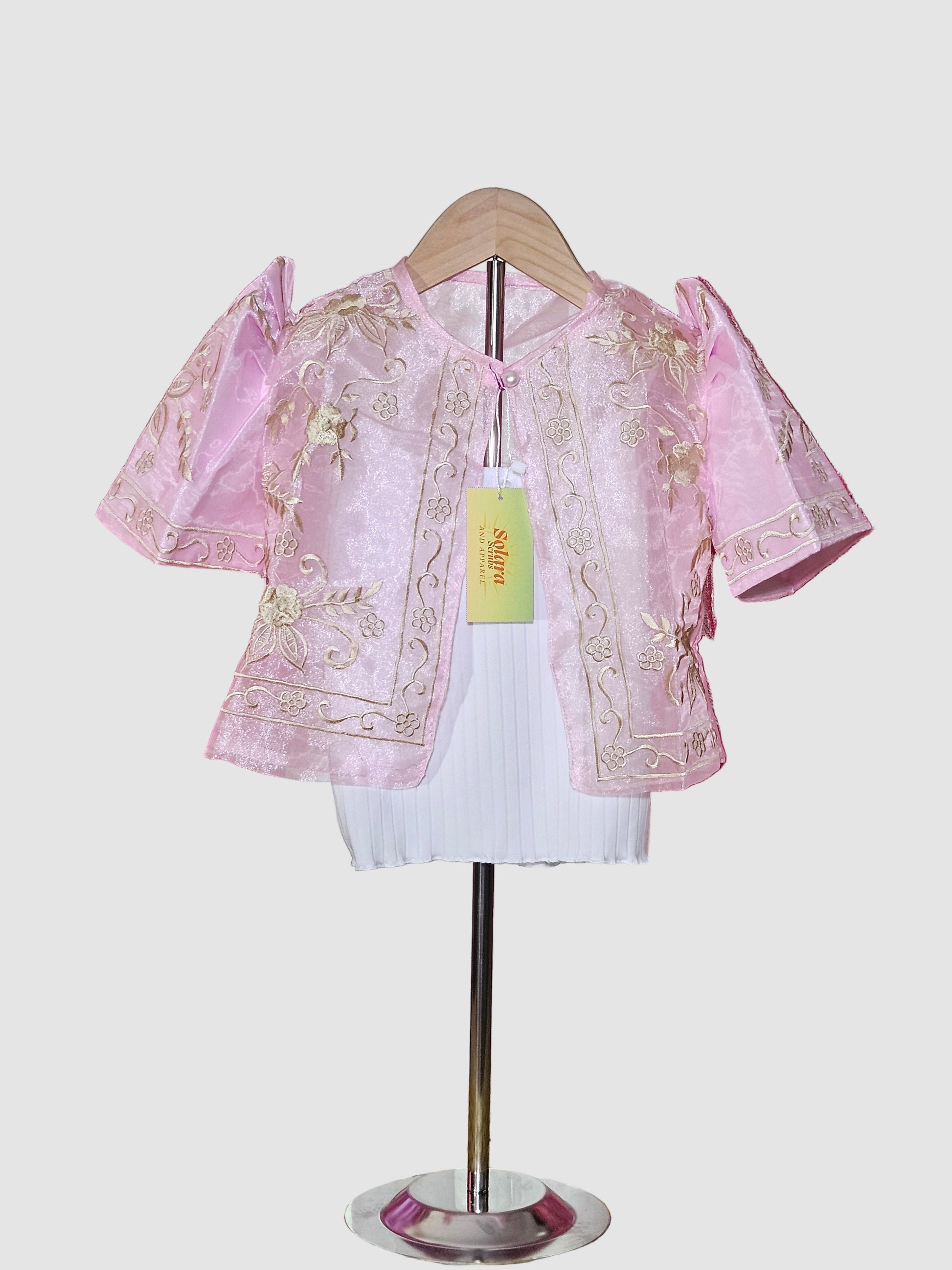 This light pink sheer bolero for kids features delicate gold embroidery, adding a touch of elegance to any outfit. Its lightweight design ensures comfort while enhancing style for special occasions.