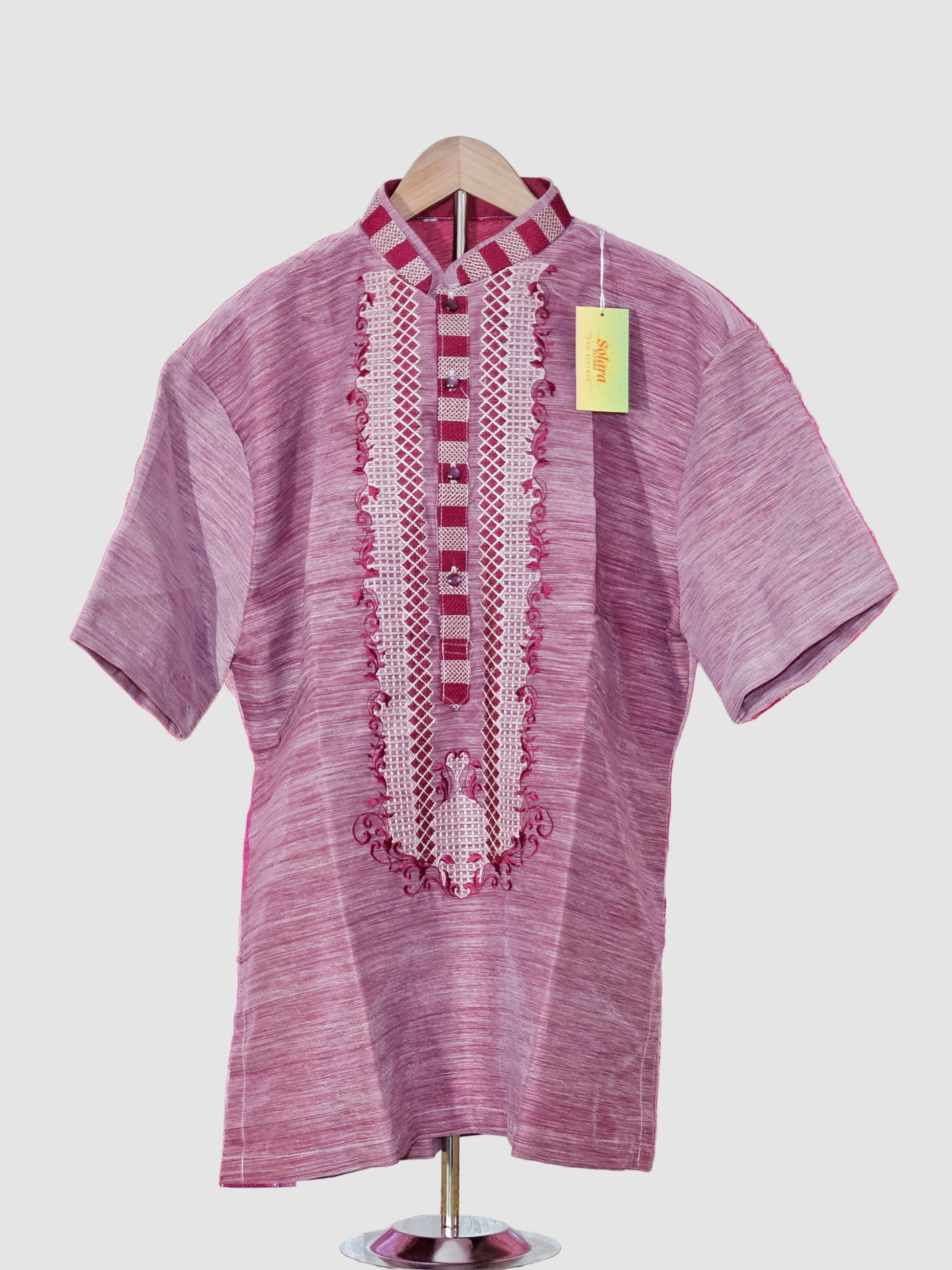 This Red Short Sleeved Barong Tagalog features intricate cream and red embroidery, combining traditional design with modern comfort. Its lightweight fabric and short sleeves make it perfect for warm weather and formal occasions.